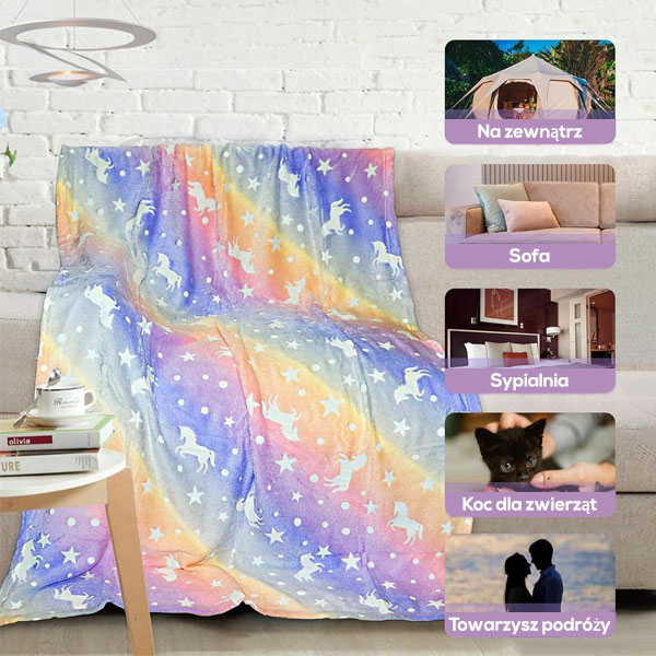 Przytulny i ciepły koc emituje światło w nocy! Możesz wybrać wzór jednorożca lub dinozaura!