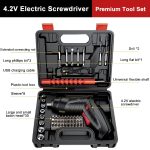 🧰 Kompletny zestaw 46 elementów, w zestawie walizka i bateria – śrubokręt, bity, wiertła, elastyczny wałek, nasadki, walizka narzędziowa i kabel do ładowania USB, wszystko gotowe do użycia od razu po wyjęciu z pudełka