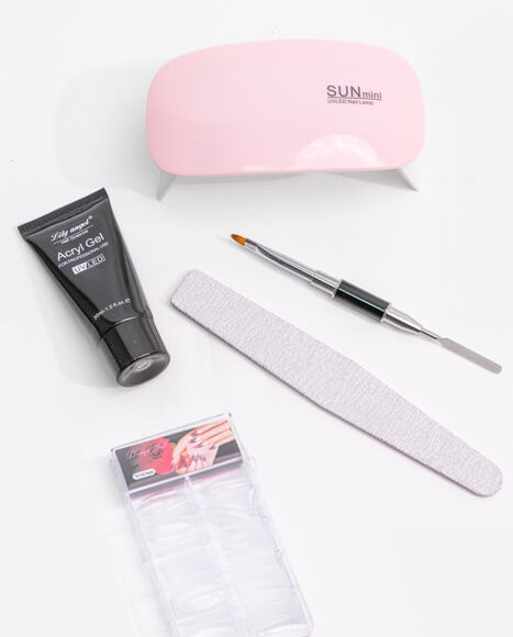 Opakowanie zawiera: 1 x żel, 100 x plastikowe paznokcie, 1 x szpatułka i pędzelek, 1 x lampa UV/LED, 1 x instrukcja obsługi
